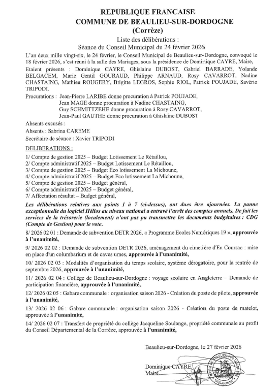 Liste des délibérations du 24 février 2026