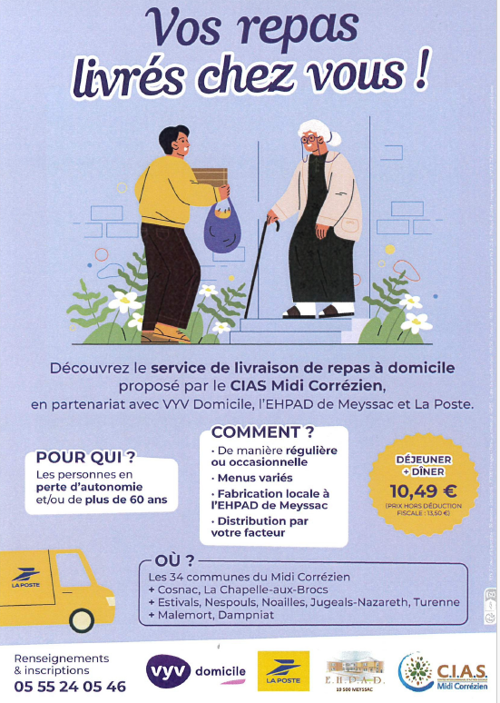 Le CIAS du Midi Corrézien, VYV Domicile ainsi que l’EPHAD de Meyssac propose un service de livraison de repas à domicile destiné aux personnes en perte d’autonomie et/ou de plus de 60 ans.